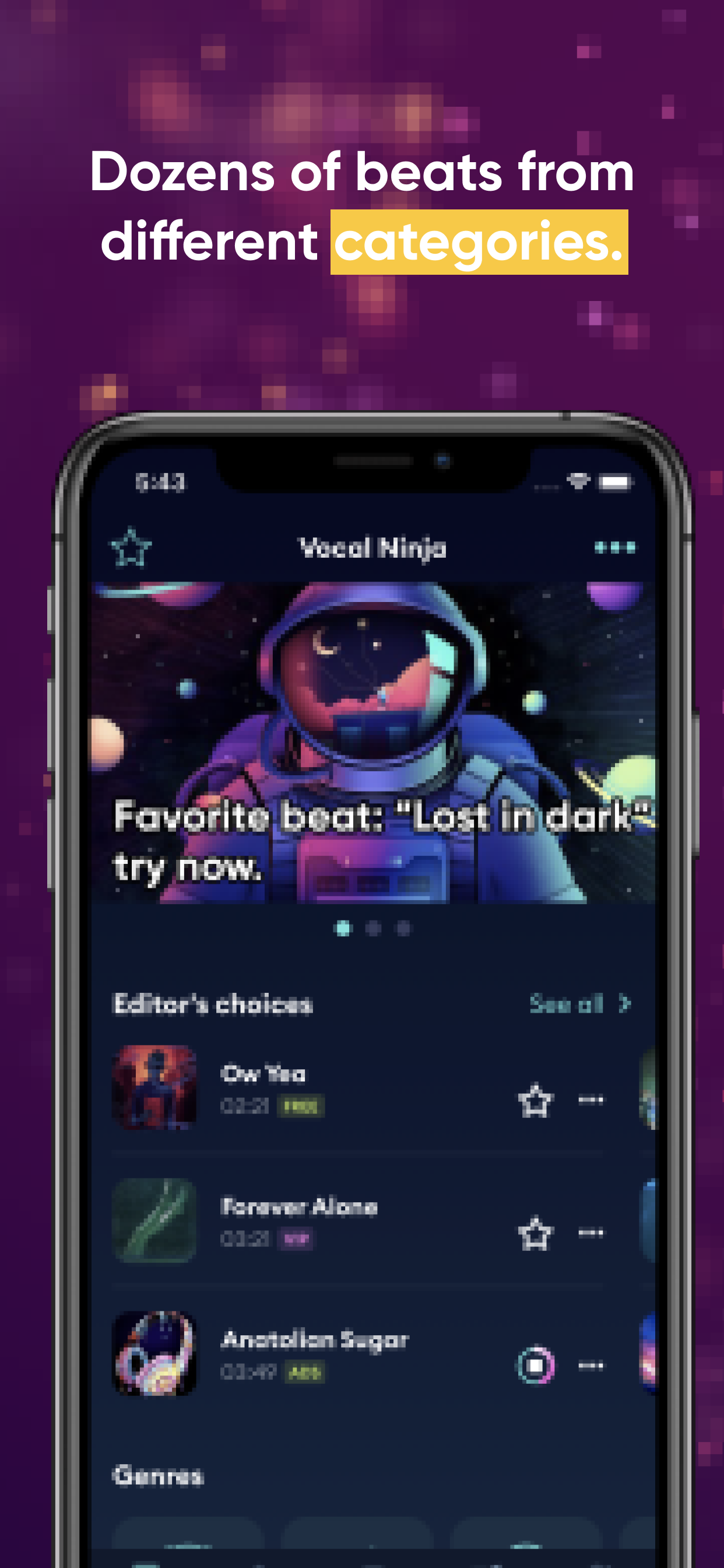 About subscriptions: Some of our beats and studio effects needs VIP subscription. After starting a subscription, you will able to use the app without any ads and without a restriction. Subscription period is (one) 1 week or (one) 1 month or (one) 1 year. In every renewal period, your subscription renews for the amount of your selected package. You will see the total amount in the app when you select a package. Payment will be charged to your iTunes account during confirmation of purchase. Subscriptions automatically renews unless auto-renew is turned off at least 24-hours before the end of the current period. Your account will be charged for renewal within 24 hours prior to the end of the current period, and the cost of the renewal will be identified as well. Subscriptions may be managed by the user and auto-renewal may be turned off in the user's Account Settings after purchase. Any unused portion of a free trial period, if offered, will be forfeited when the user purchases a subscription to that publication, where applicable. Privacy policy: https://vocalninja.com/privacy.php Term of use: https://vocalninja.com/tos.php
